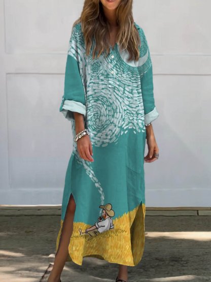 Van Gogh Style Rice Field Decorative Pattern Pocket Cotton Dress