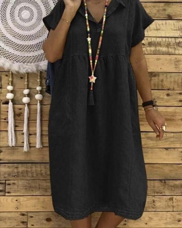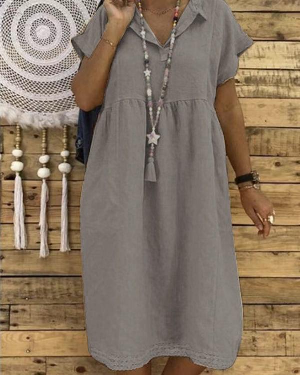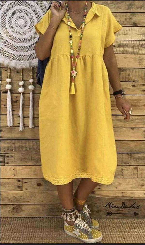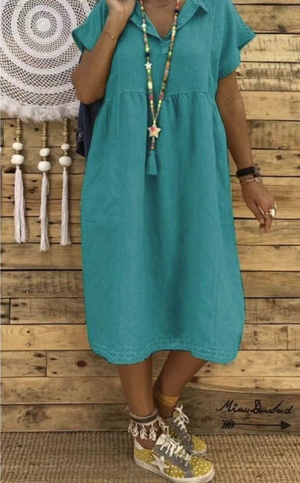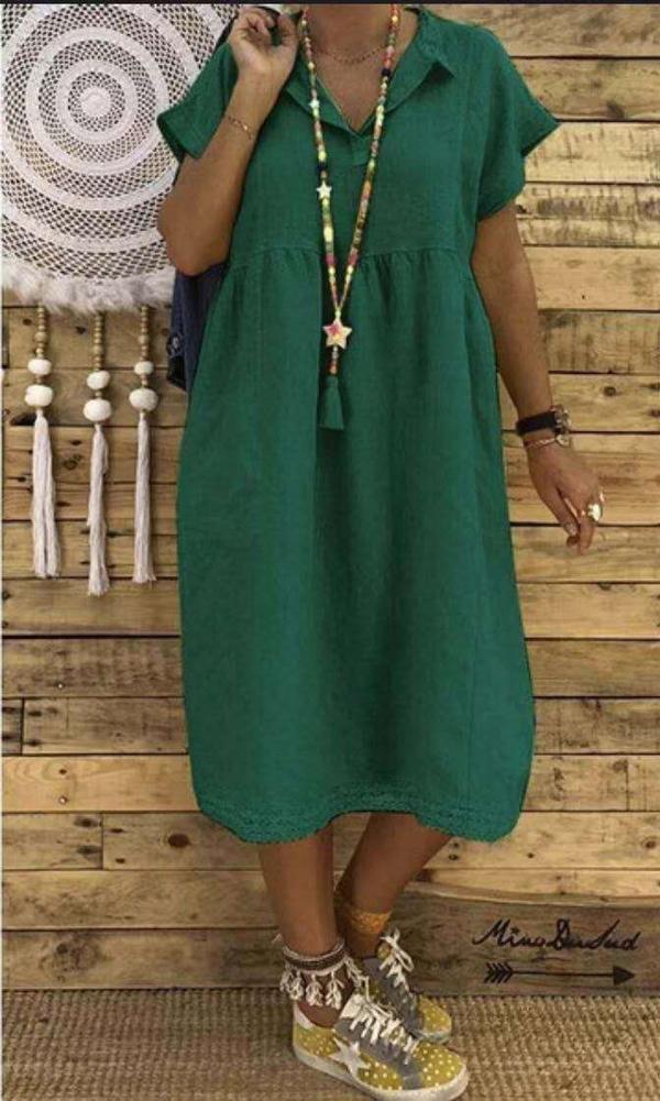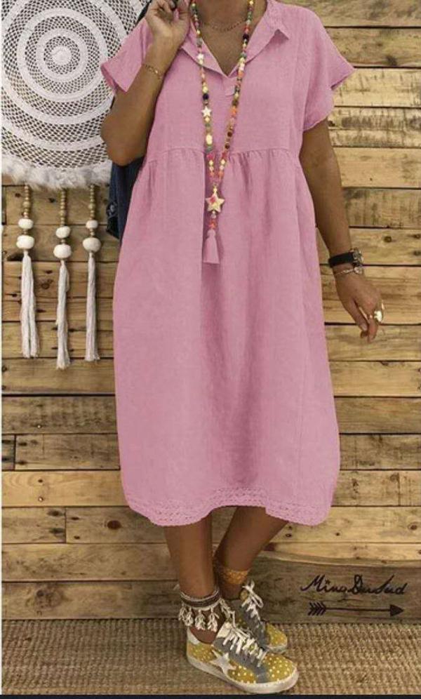 Women Plus Size Linen Cotton Short Sleeve Midi Dress