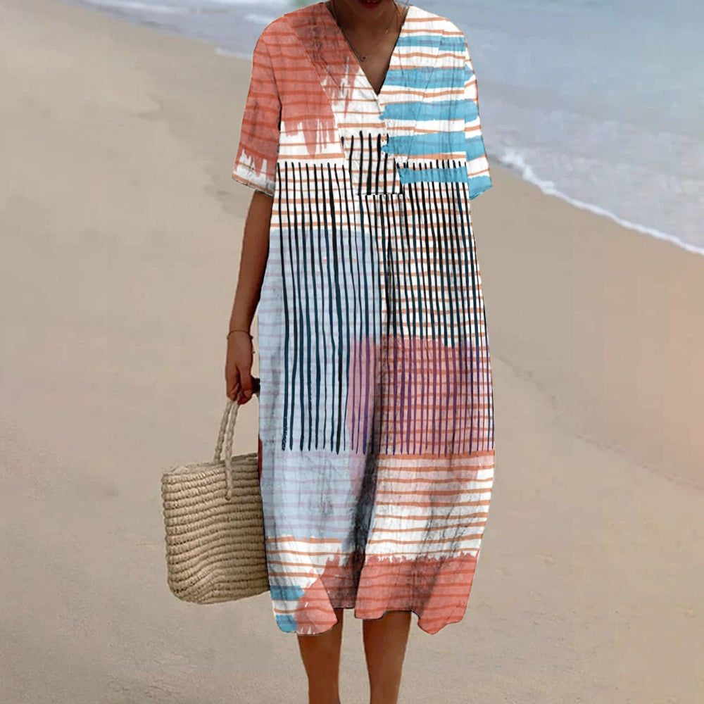 Women's Abstract Stripe Print Flowy Linen Dress