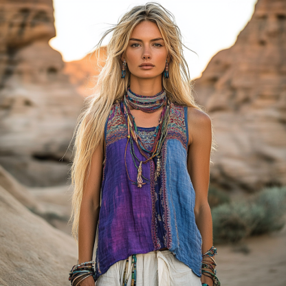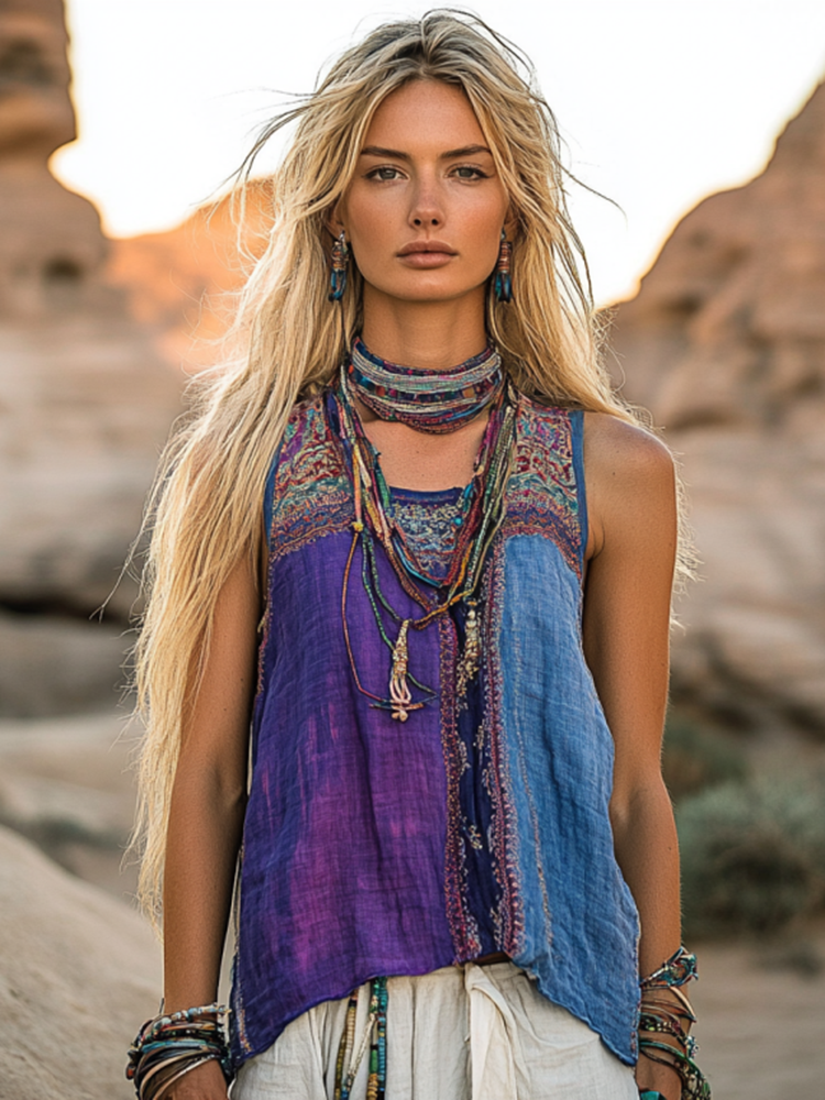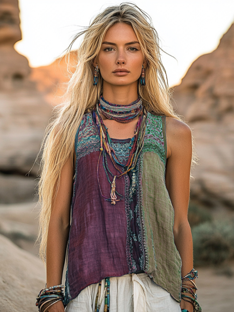 Women's Bohemia Ethnic Patchwork Style Linen Sleeveless Top
