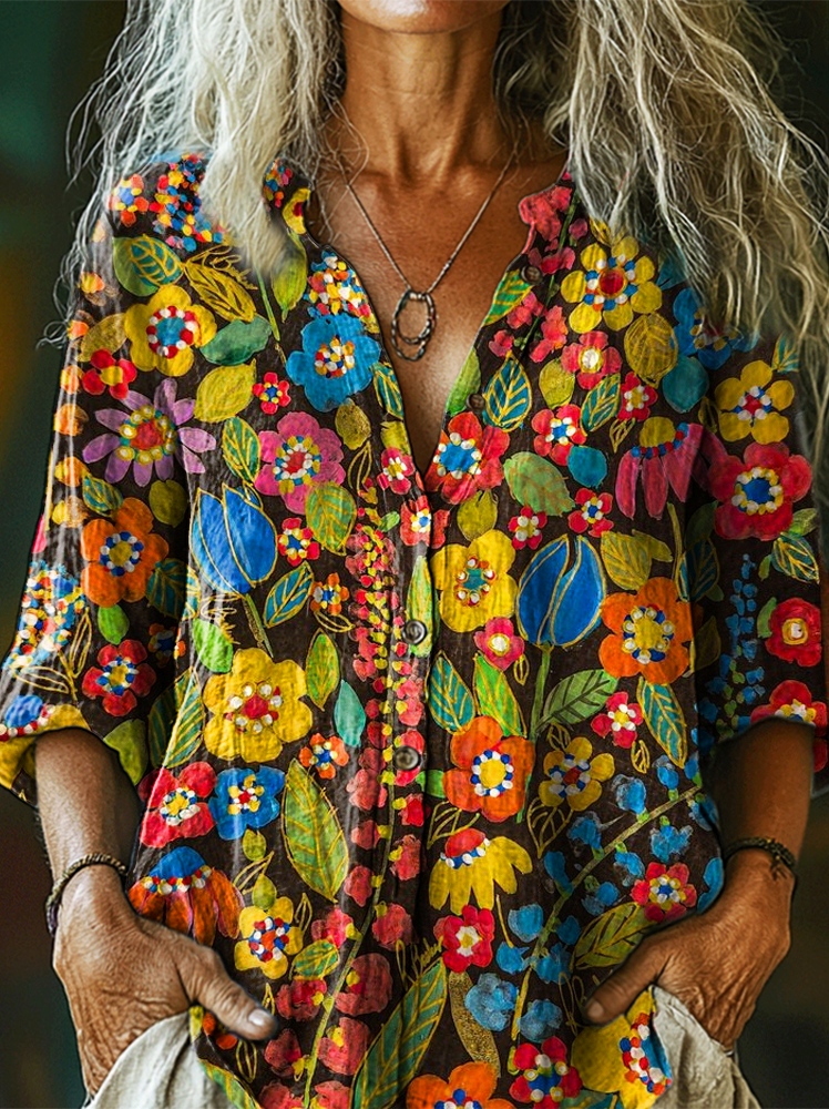 Women's Bohemian Floral Collage Print Casual Cotton Linen Shirt