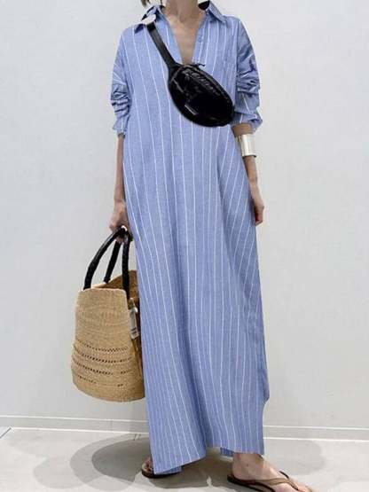 Women's Cotton Linen Striped Cozy Casual Shirt Dress
