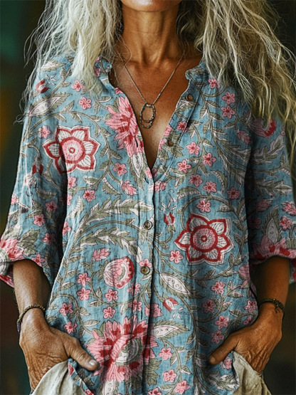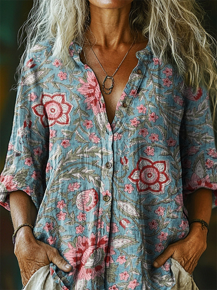 Women's Floral Pattern Art Print Casual Cotton Linen Shirt