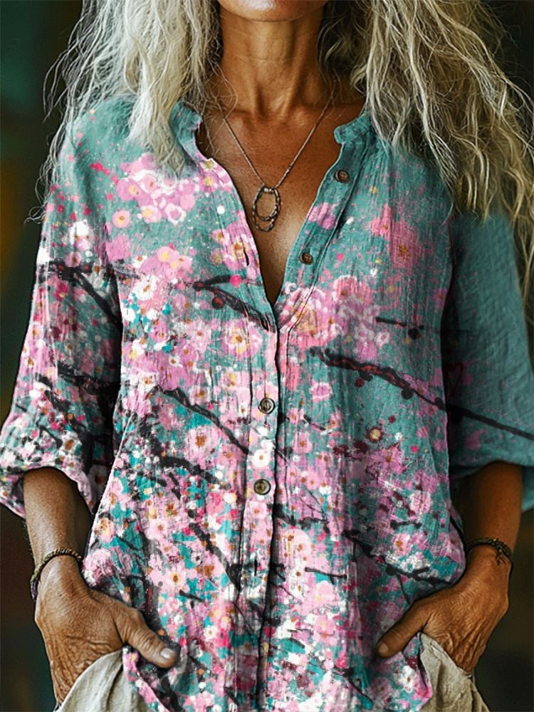 Women's Floral Pattern Art Print Casual Cotton Linen Shirt