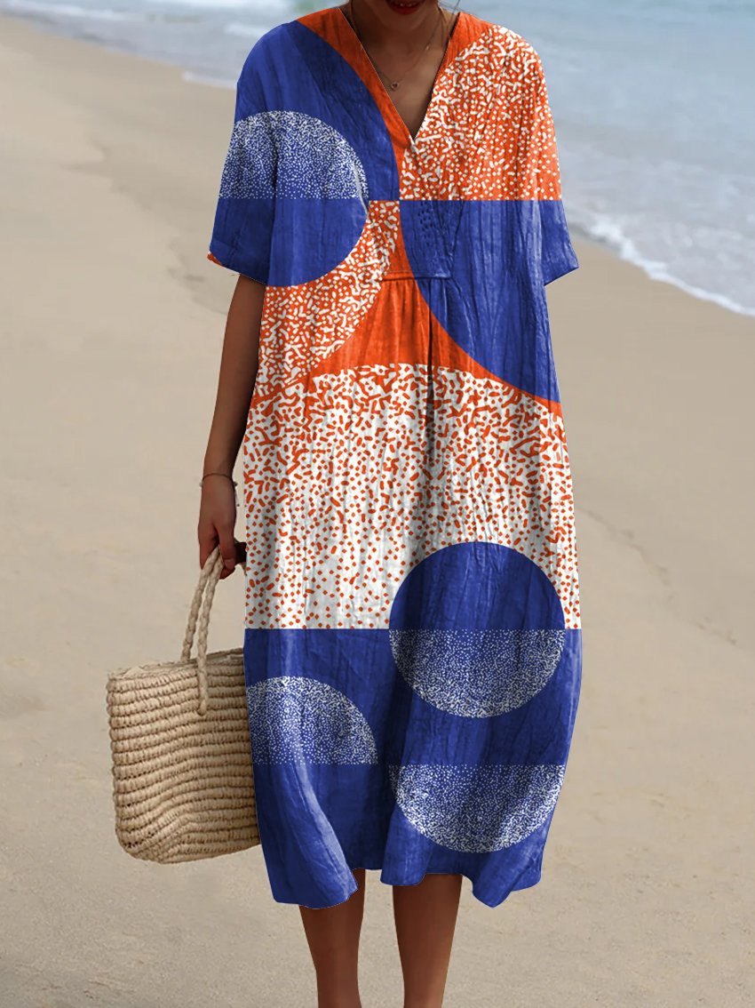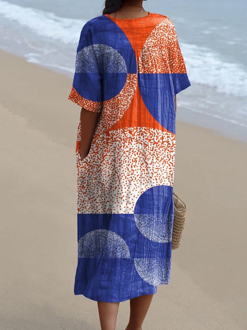 Women's Orange-blue Abstract Geometric Art Watercolor Splash Fluid Art Print Flowy Dress