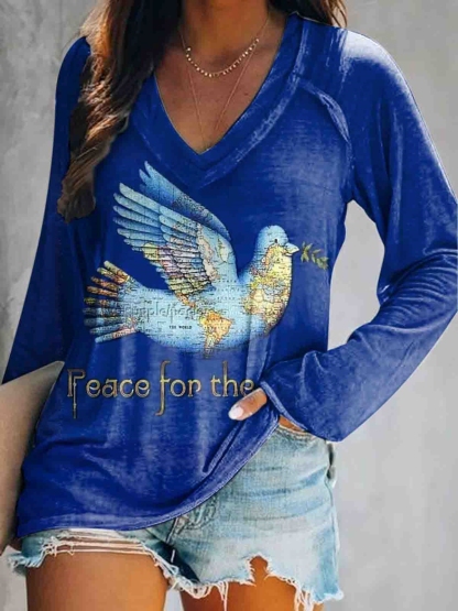Women's PEACE FOP THE WORLD Graphic Art Print V-Neck Long Sleeve Top