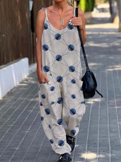 Women's Retro Polka Dot Stripe Design Casual Pocket Jumpsuit