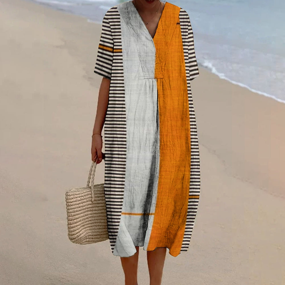 Women's Stripe Patchwork Print Flowy Linen Dress