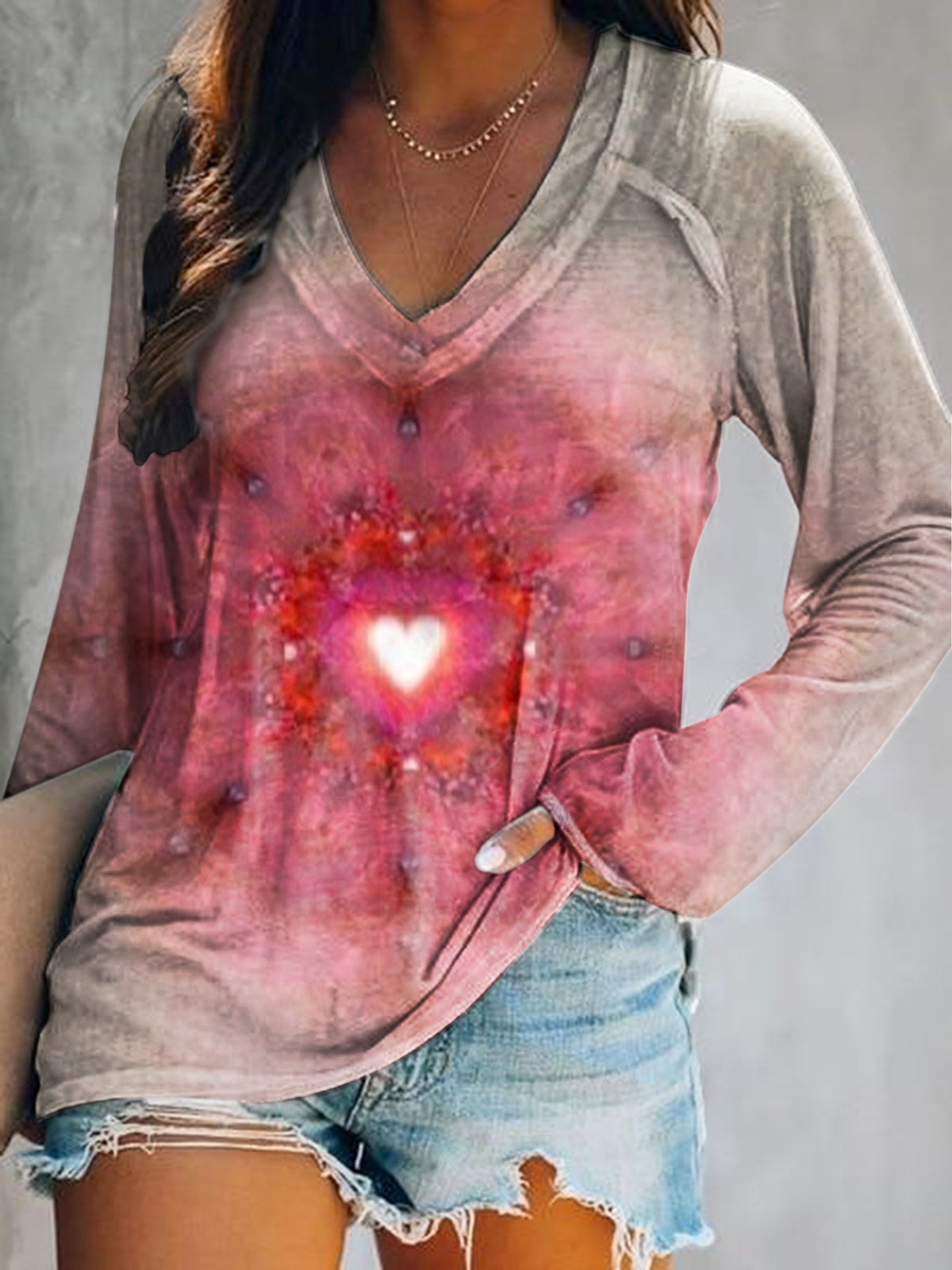 Women's Tie-Dye Heart Art Print V-Neck Long Sleeve Top