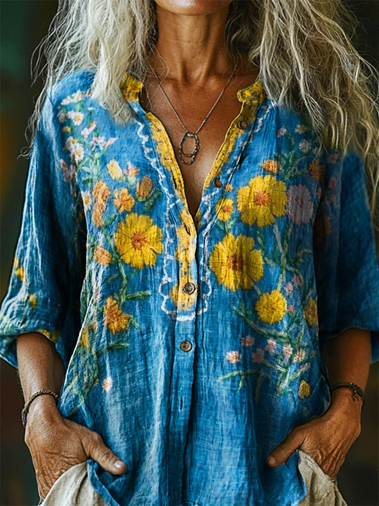 Women's Vintage Bohemian Floral Art Print Casual Cotton Linen Shirt