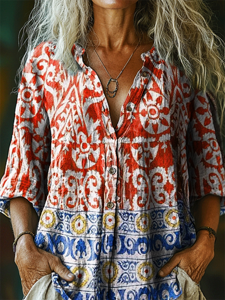Women's Vintage Bohemian Floral Art Print Casual Cotton Linen Shirt