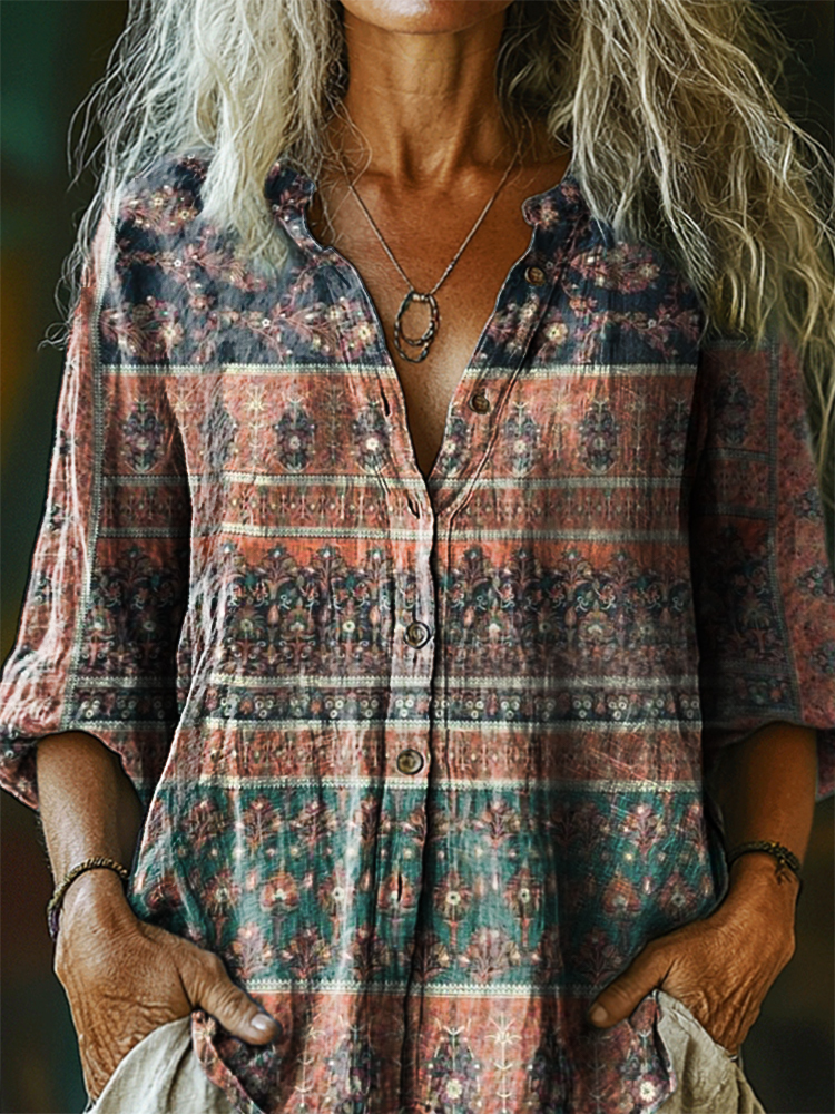 Women's Vintage Ethnic Floral Art Print Casual Cotton Linen Shirt