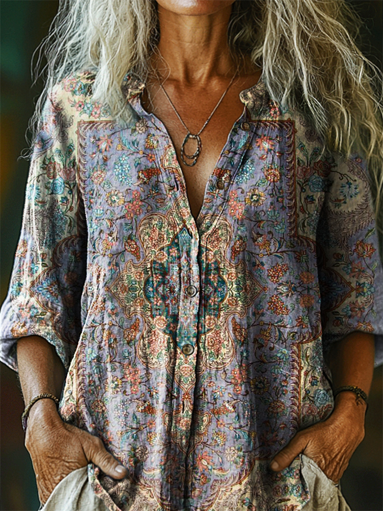 Women's Vintage Ethnic Floral Art Print Casual Cotton Linen Shirt
