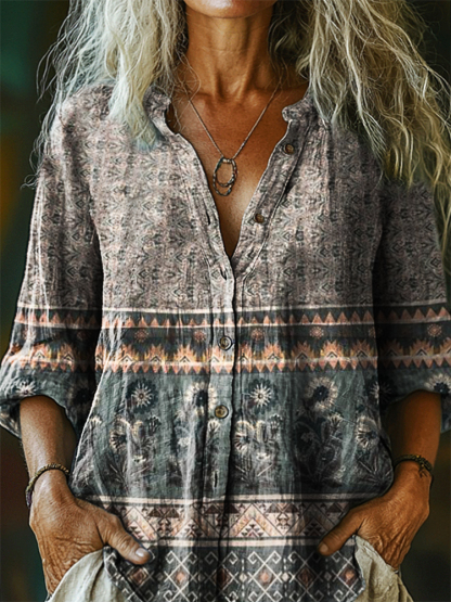 Women's Vintage Ethnic Floral Art Print Casual Cotton Linen Shirt