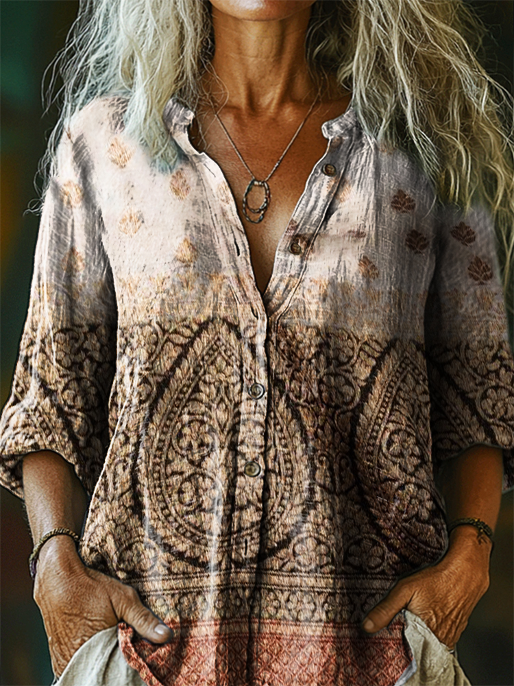 Women's Vintage Ethnic Floral Art Print Casual Cotton Linen Shirt