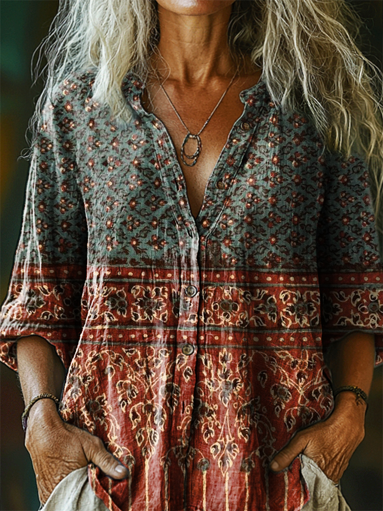 Women's Vintage Ethnic Floral Art Print Casual Cotton Linen Shirt