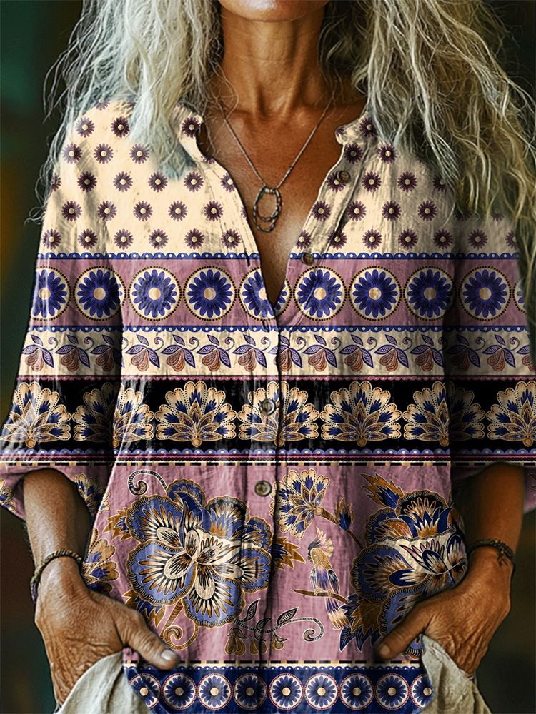 Women's Vintage Ethnic Style Floral Tattoo Pattern Art Print Casual Cotton Linen Shirt