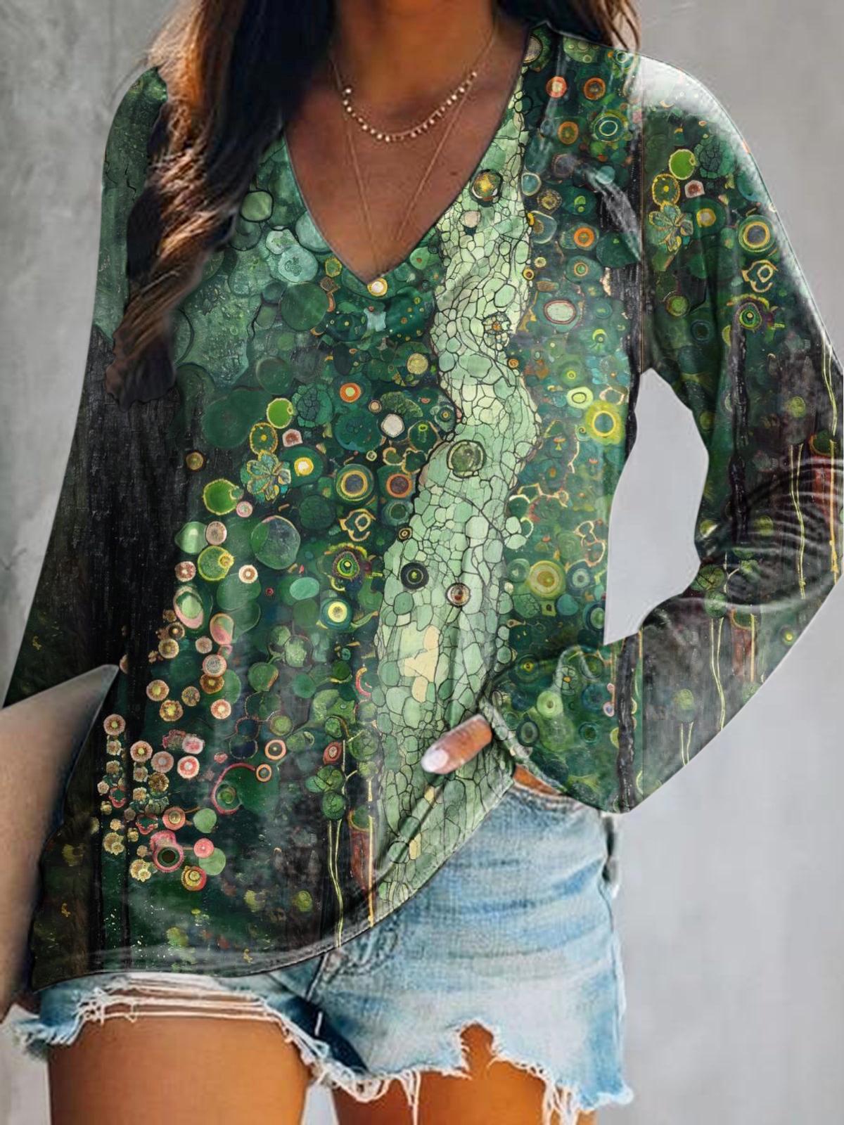 Women's Vintage Irregular Pattern Art Print V-Neck Long Sleeve Top