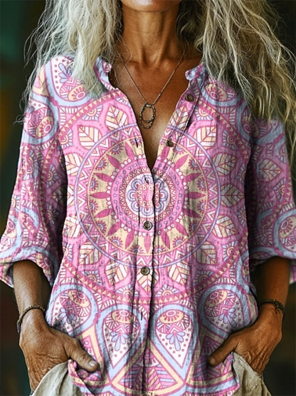 Women's Vintage Mandala Tattoo Pattern Art Print Casual Cotton Linen Shirt