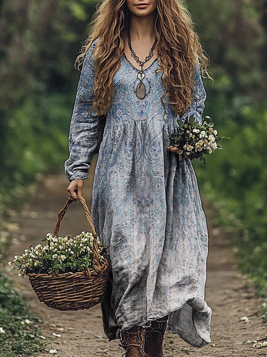 Women's Boho Folkloric Pattern Print V Neck Pocket Cotton Dress