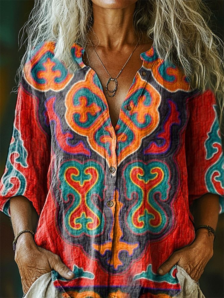 Women's Ethnic Style Tattoo Pattern Art Print Casual Cotton Linen Shirt