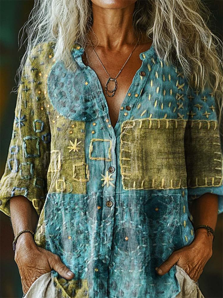 Women's Patchwork Pattern Art Print Linen Cotton V-Neck Casual Shirt