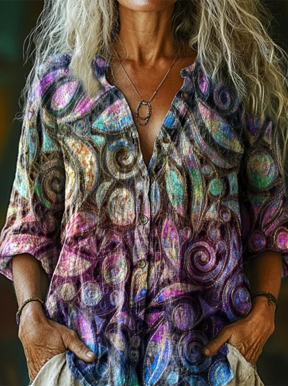 Women's Retro Gradient Floral Texture Art Print Casual Cotton Linen Shirt