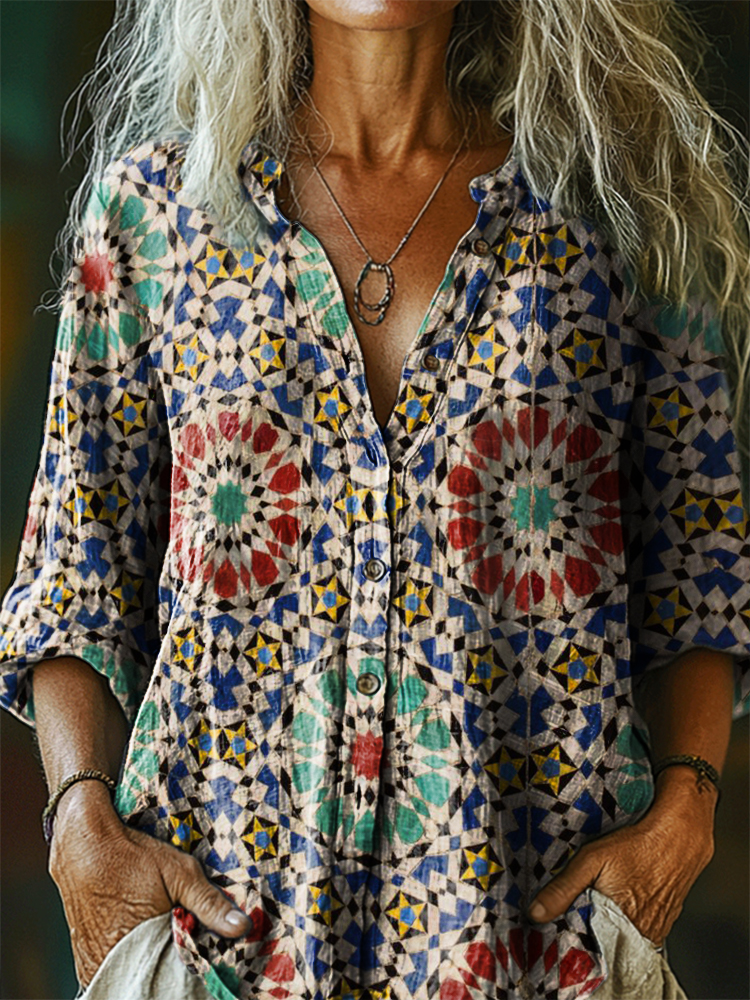 Women's Vintage Bohemian Floral Art Print Casual Cotton Linen Shirt