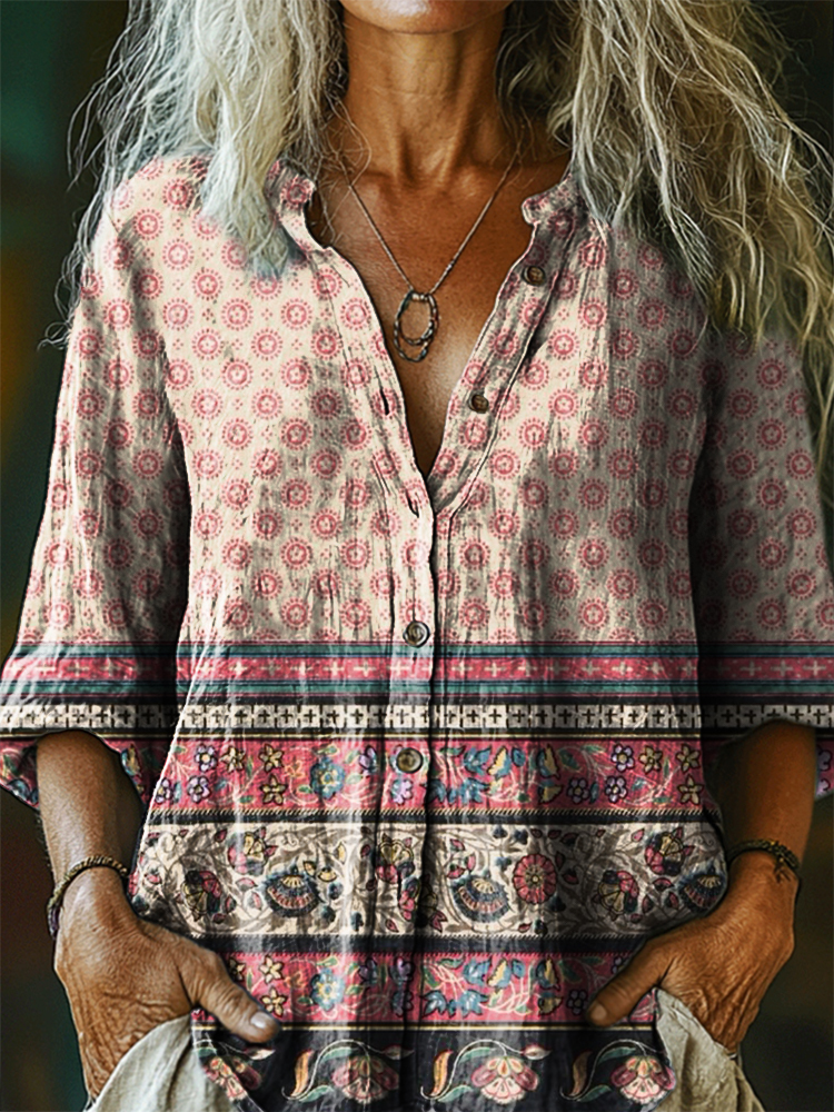 Women's Vintage Ethnic Floral Art Print Casual Cotton Linen Shirt