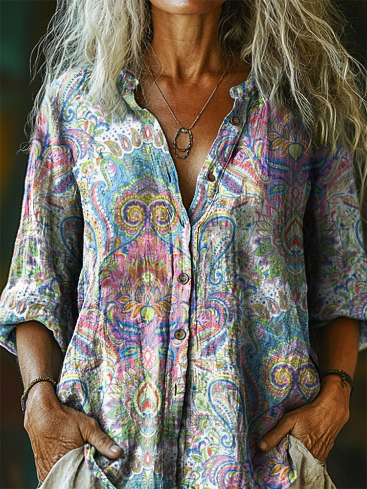 Women's Vintage Ethnic Floral Art Print Casual Cotton Linen Shirt
