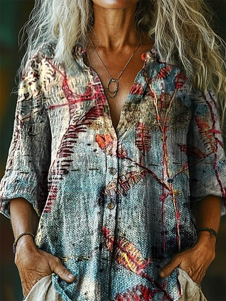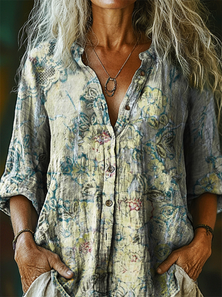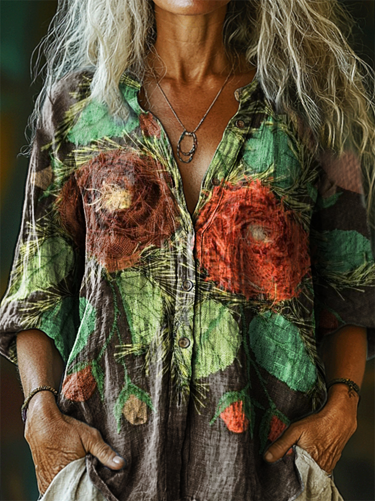 Women's Vintage Floral Art Print Casual Cotton Linen Shirt