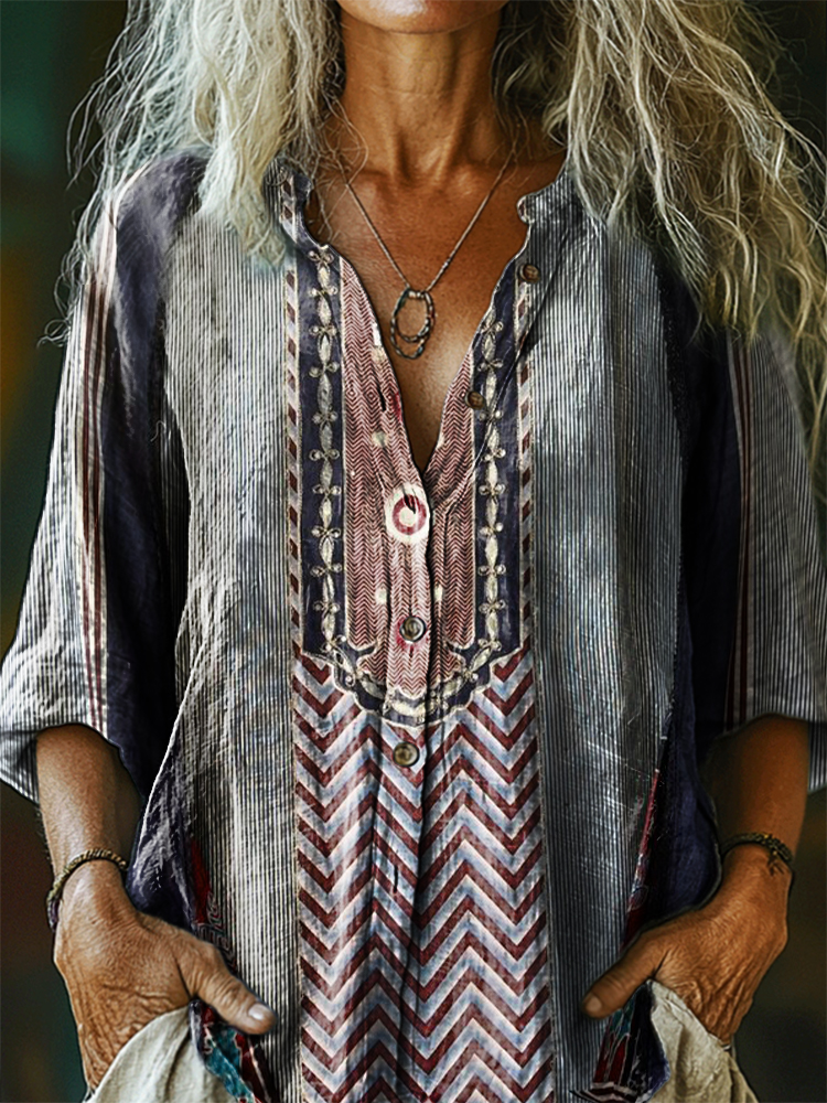 Women's Retro Ethnic Totem Art Print Casual Cotton Linen Shirt