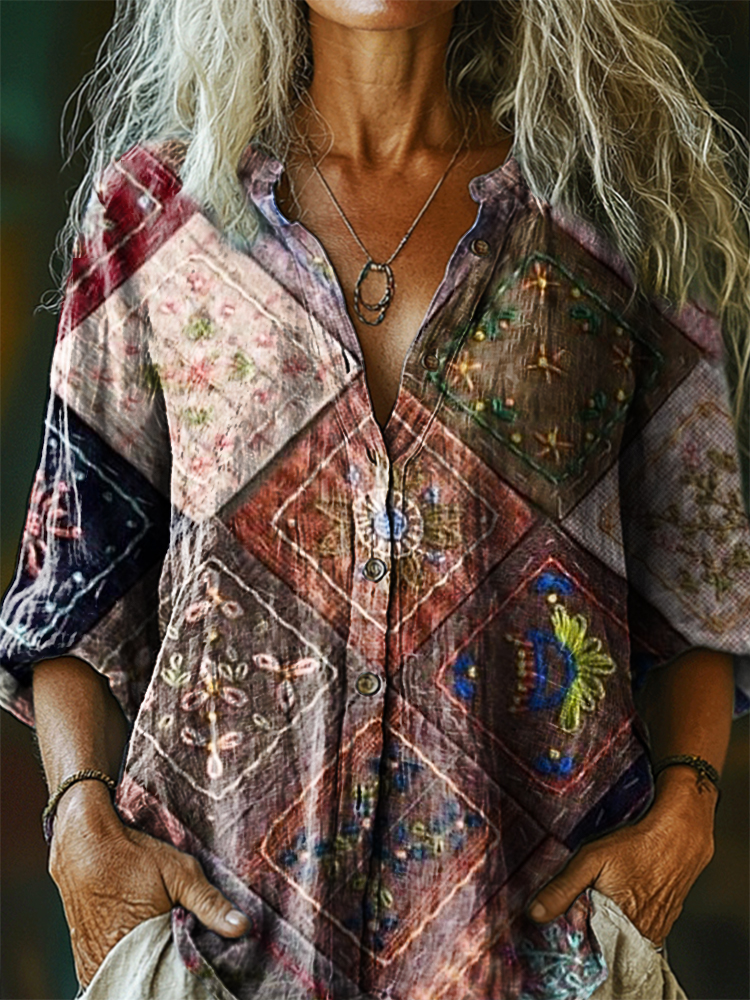 Women's Vintage Floral Patchwork Art Print Casual Cotton Linen Shirt