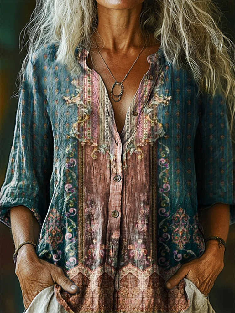 Women's Vintage Bohemian Floral Art Print Casual Cotton Linen Shirt