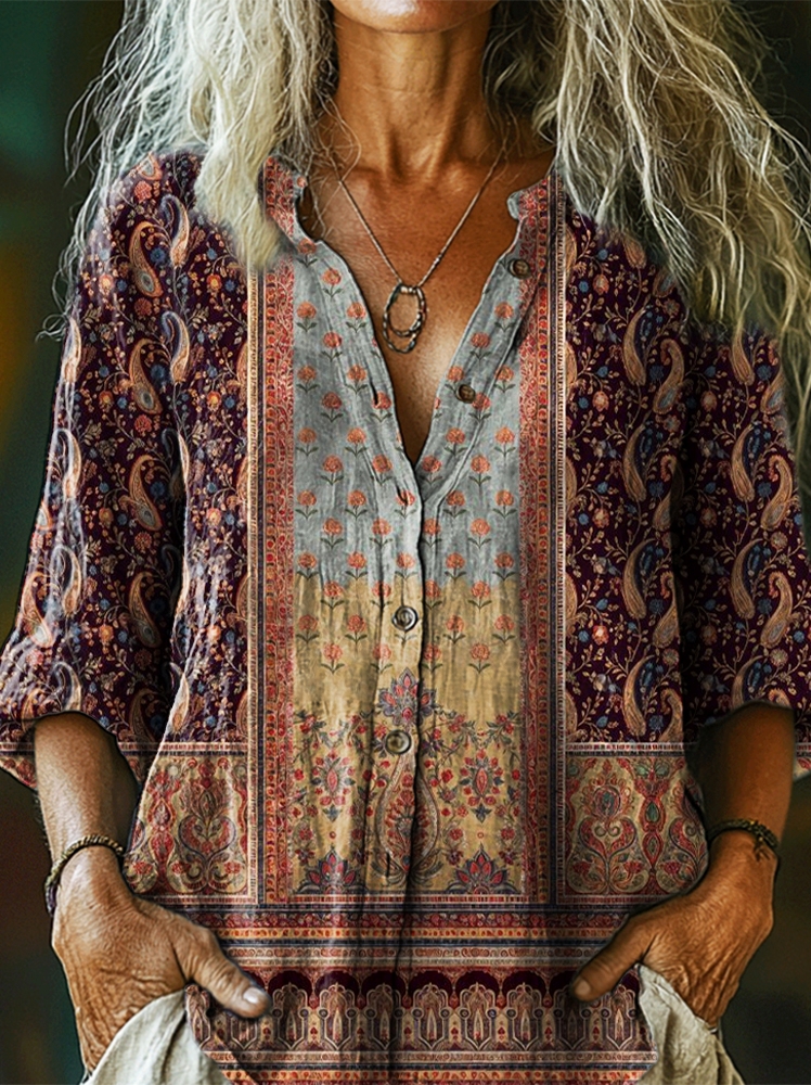 Women's Vintage Ethnic Floral Art Print Casual Cotton Linen Shirt