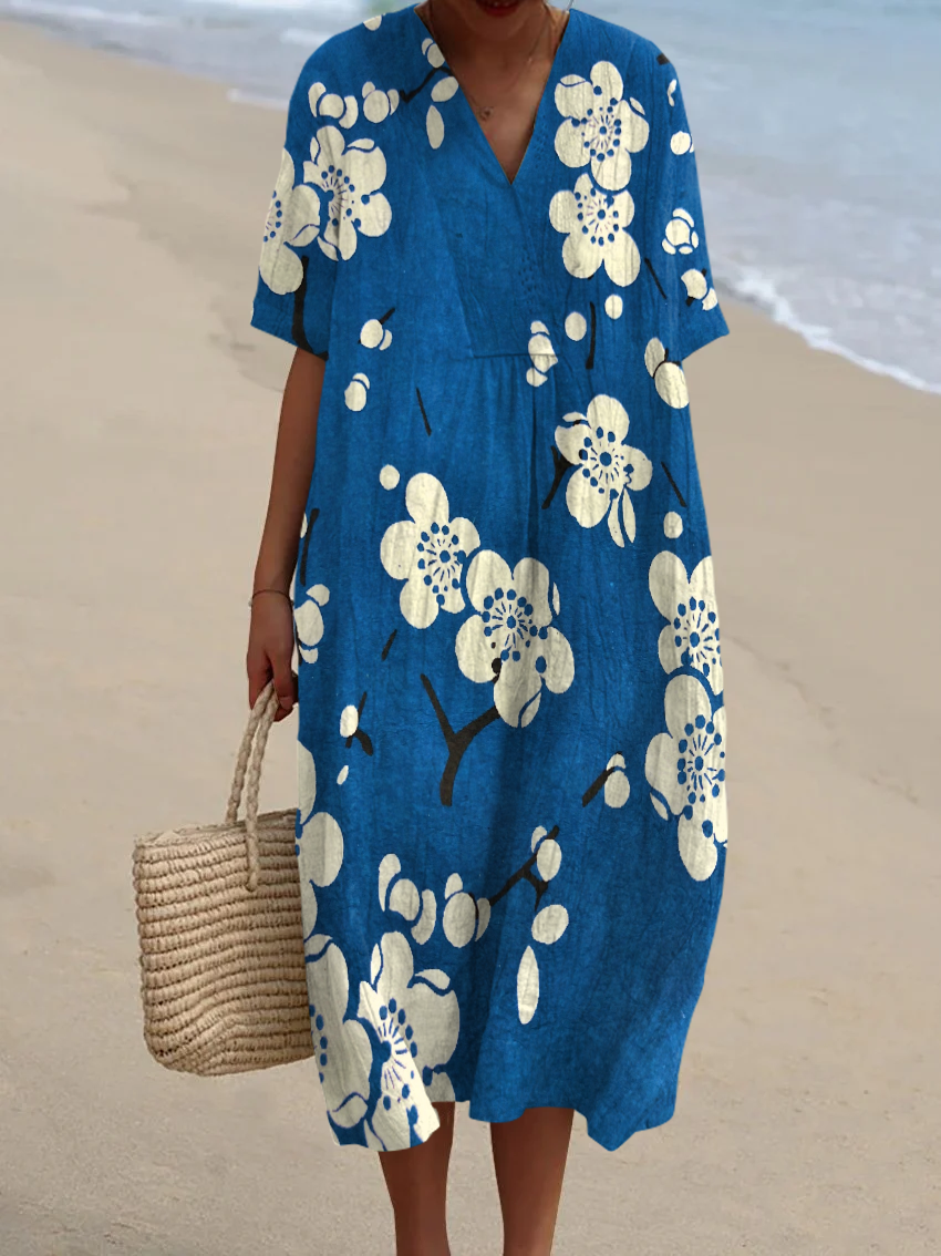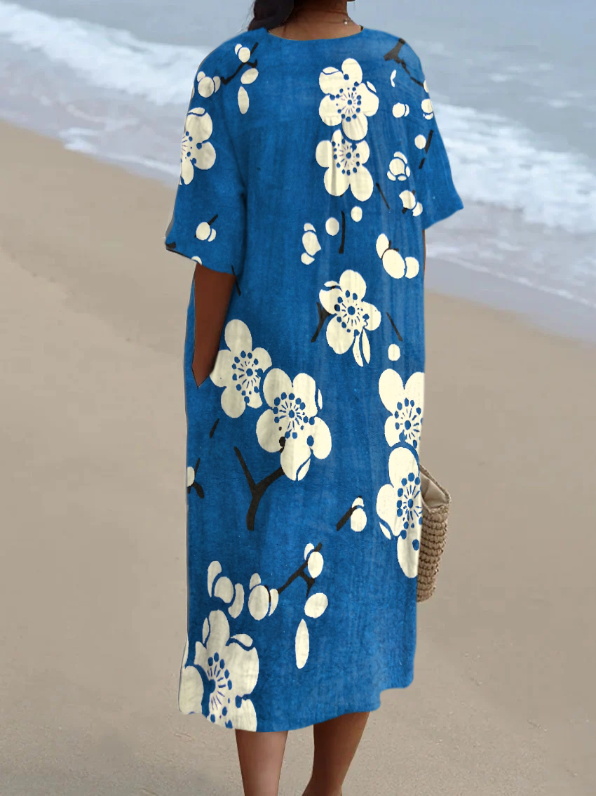 Japanese Cherry Blossom Print Women's V Neck Pocket Short Sleeve Dress