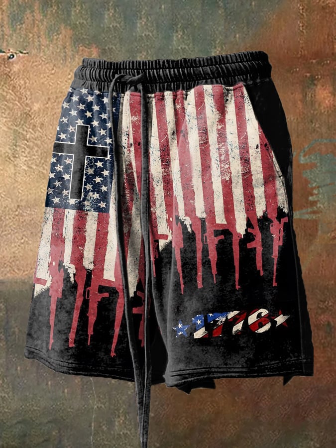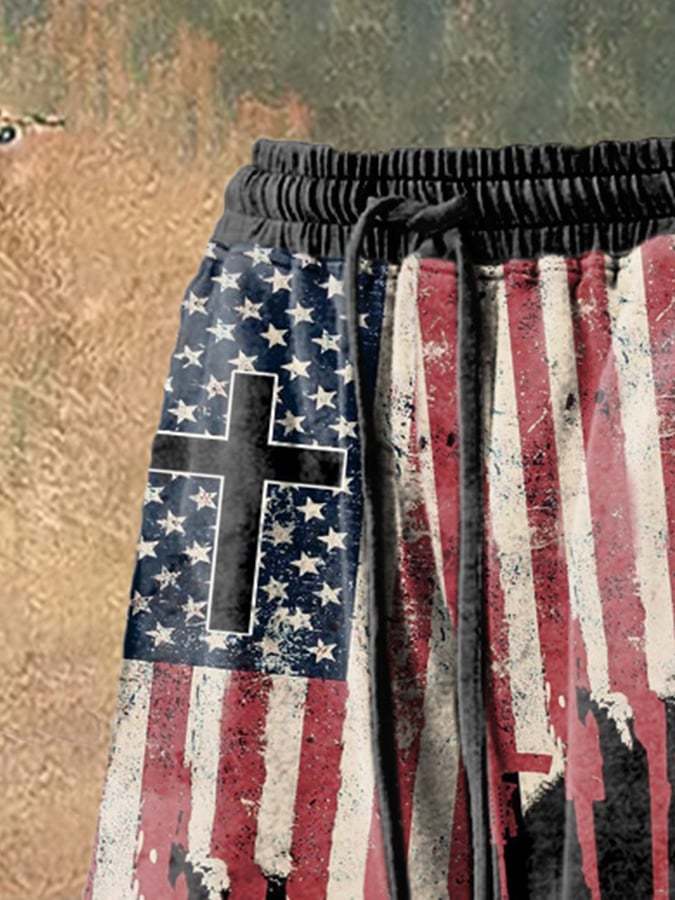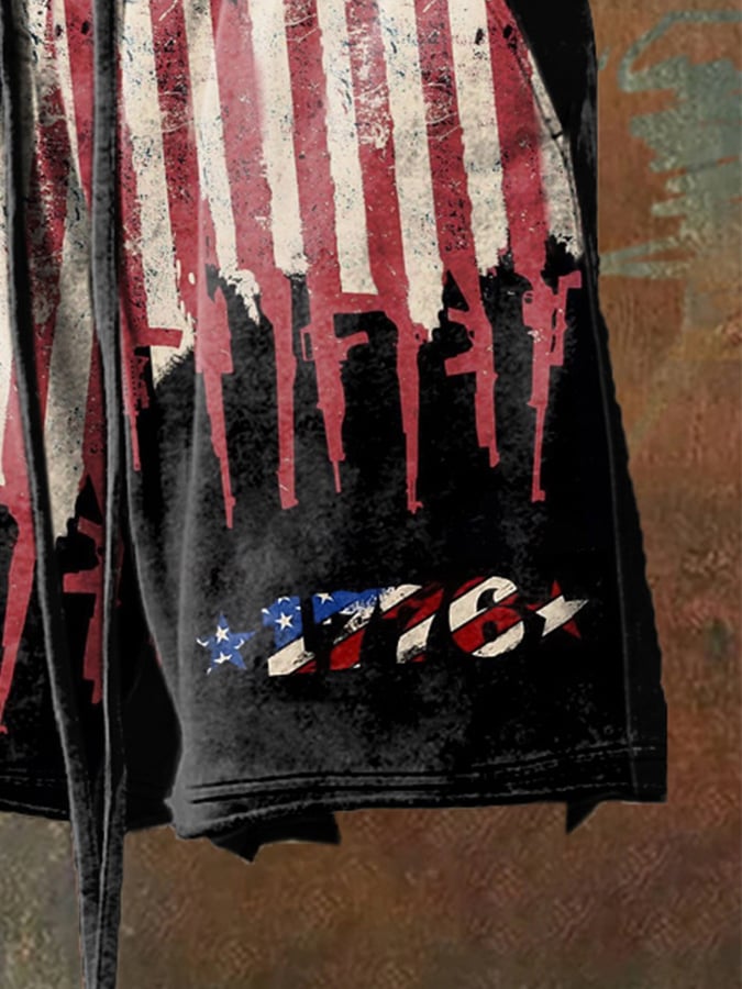 Men's Retro Distressed Hem Independence Day Print Loose Shorts
