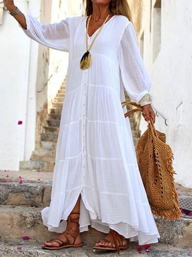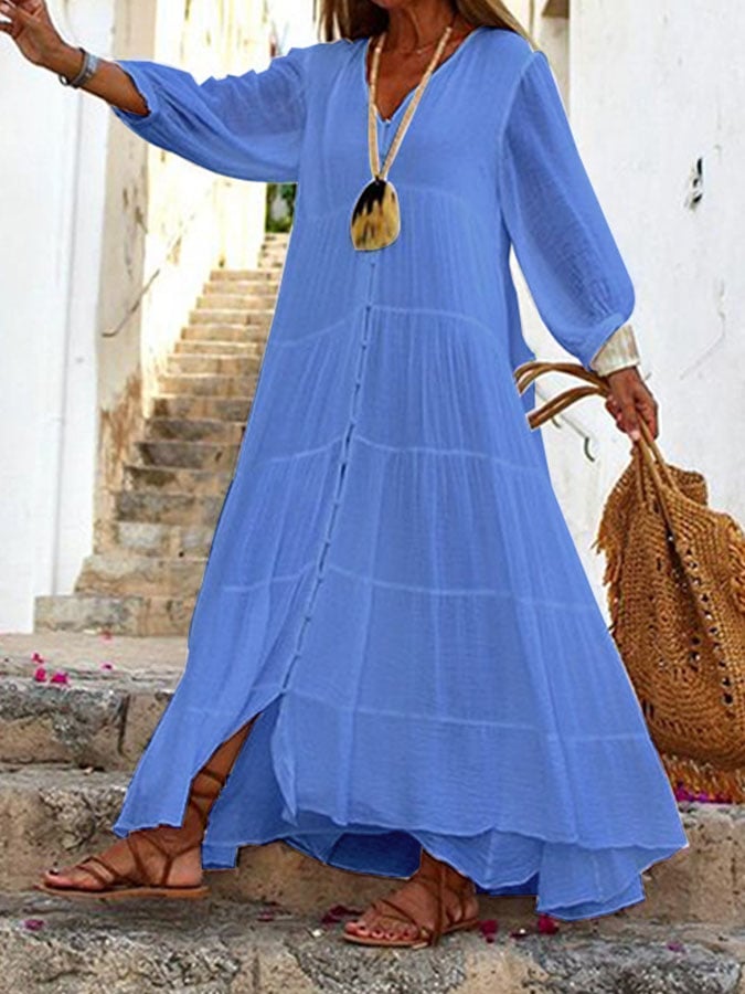 Solid Color V-Neck Long Sleeve Loose Casual Dress
