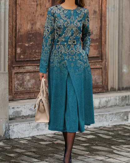 Vintage Ethnic Antique Floral Print Round Neck Long Sleeve Dress