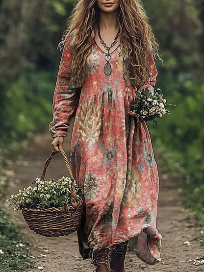 Women's Bohemian Ethnic Pattern Print V Neck Pocket Cotton Dress