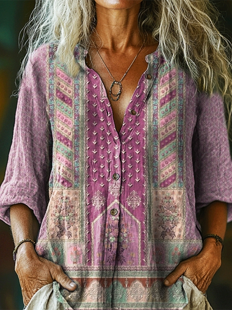 Women's Ethnic Collage Floral Totem Art Print Casual Cotton Linen Shirt