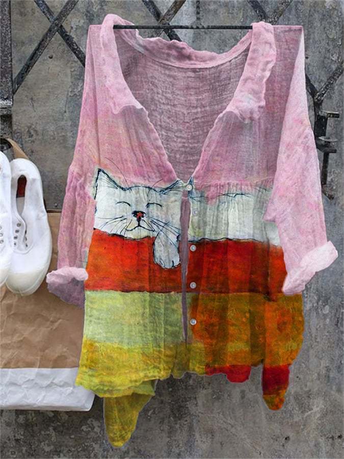 Women's Sleeping Cat Color Block Print Cotton And Linen Shirt