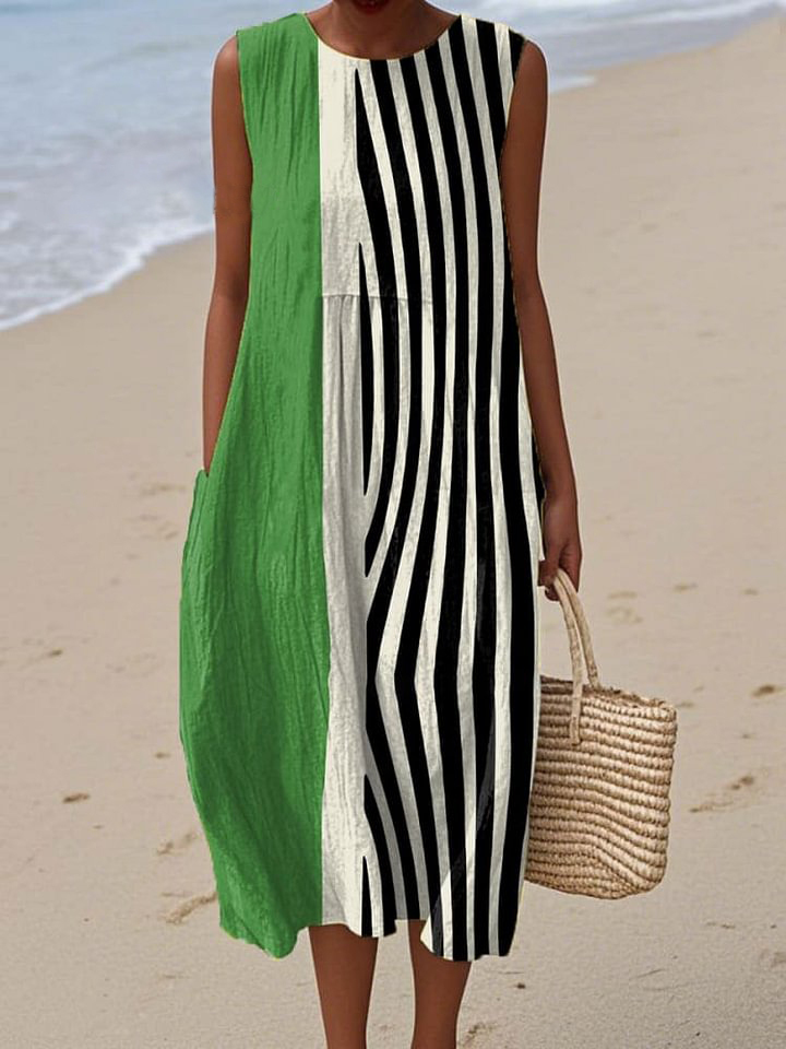 Women's Vintage Abstract Geometry Art Print Sleeveless Cotton Pocket Wrap Dress
