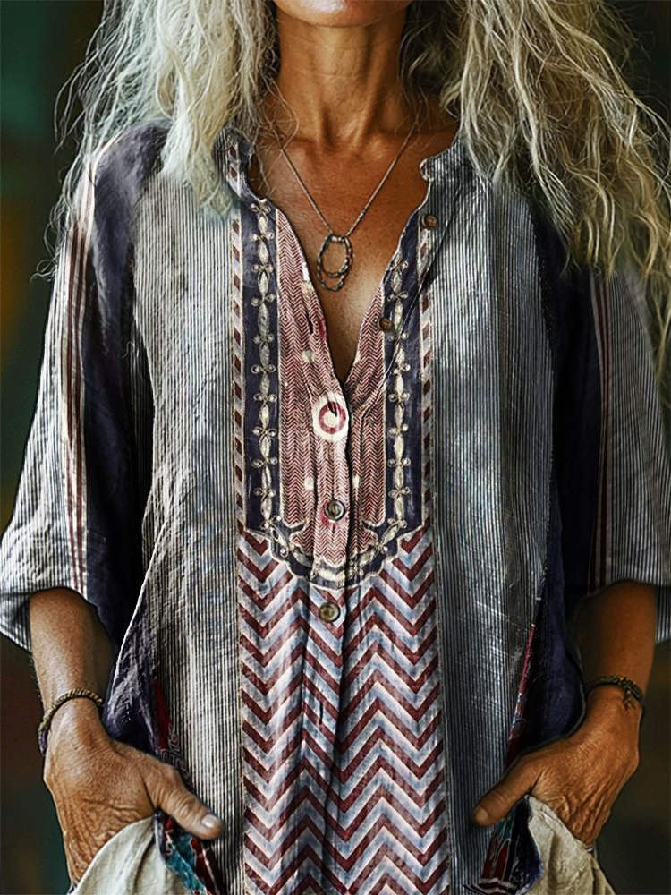 Women's Vintage Bohemian Floral Art Print Casual Cotton Linen Shirt