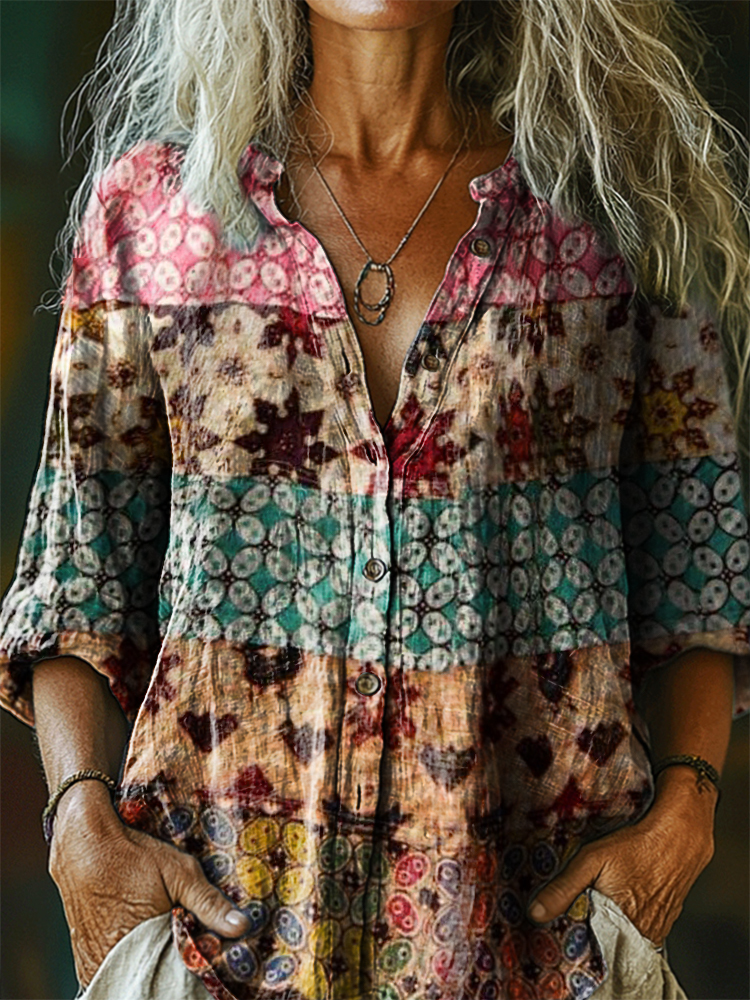 Women's Vintage Bohemian Floral Art Print Casual Cotton Linen Shirt