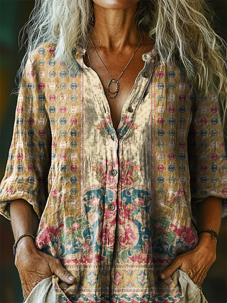 Women's Vintage Ethnic Floral Art Print Casual Cotton Linen Shirt