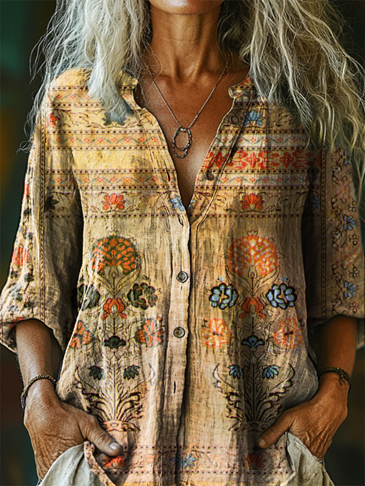 Women's Vintage Ethnic Floral Art Print Casual Cotton Linen Shirt