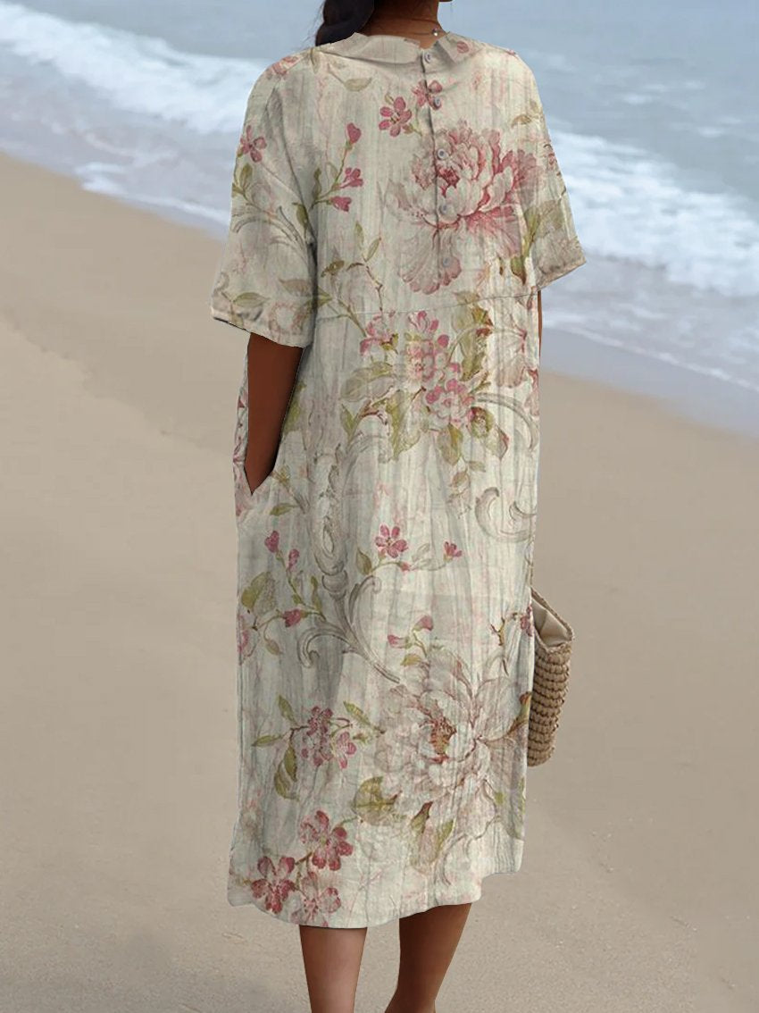 Women's Vintage Floral Art Print Pocket Linen Dress(Convertible Dress With Front And Back Option)
