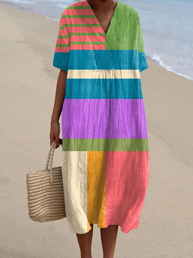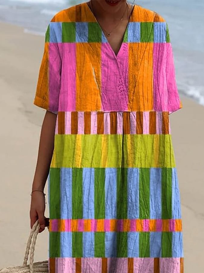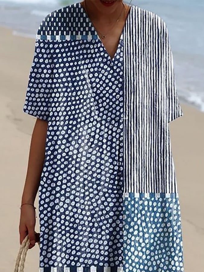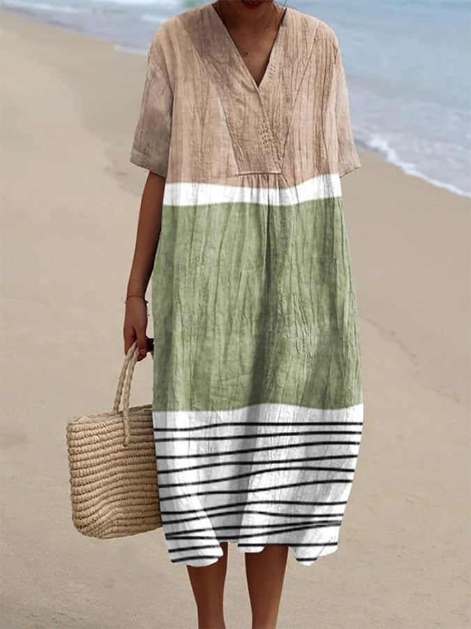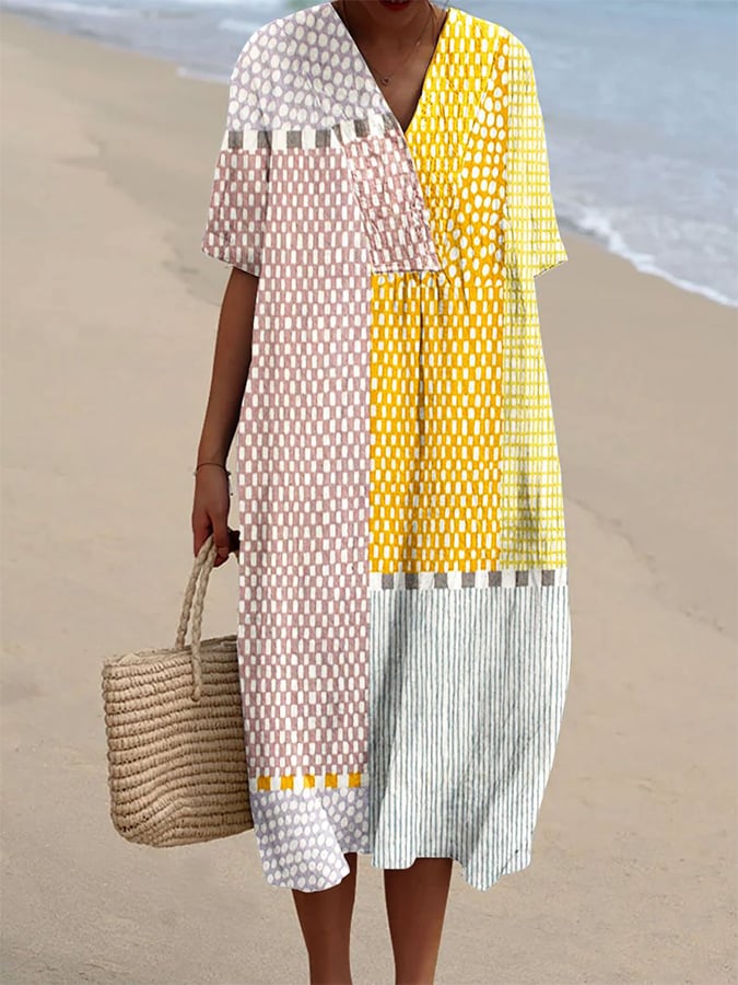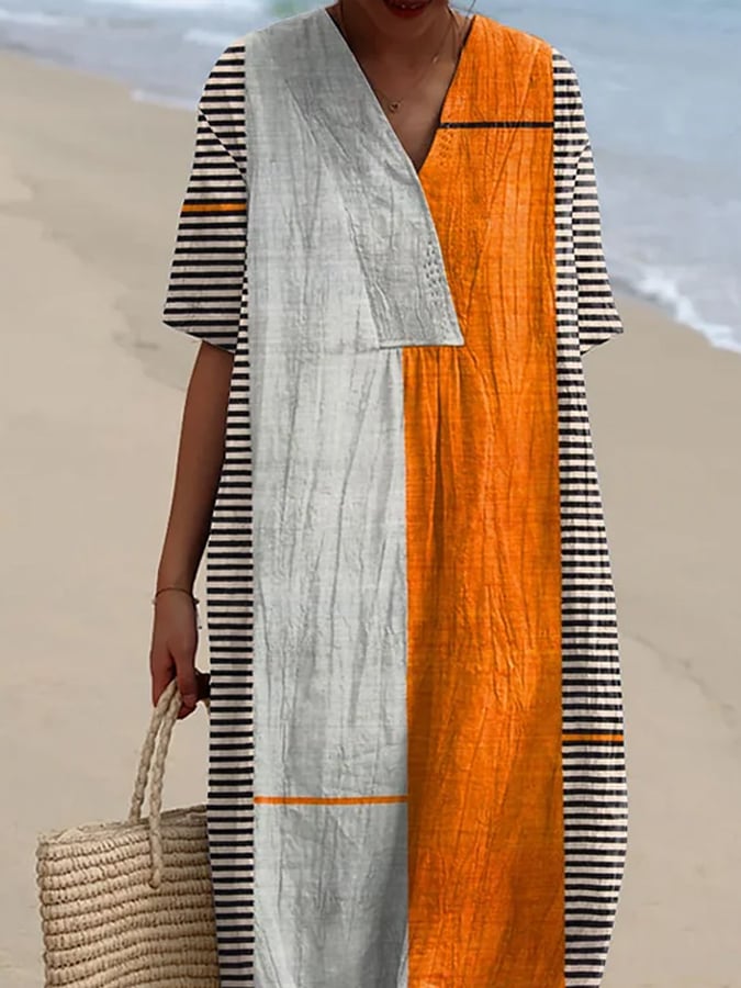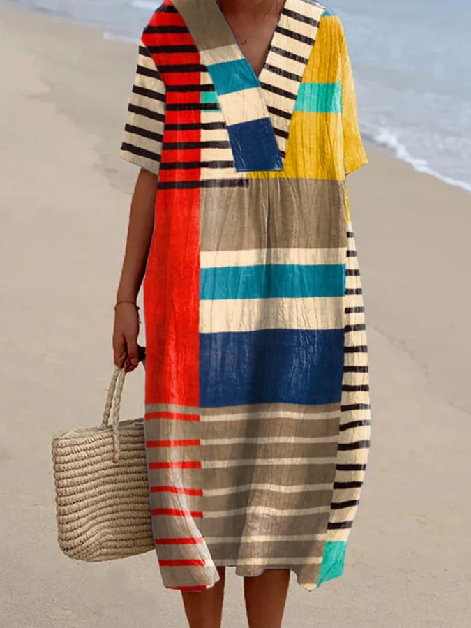 Women's Casual V-Neck Abstract Color Block Loose Dress