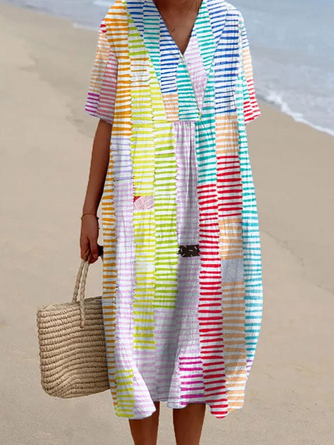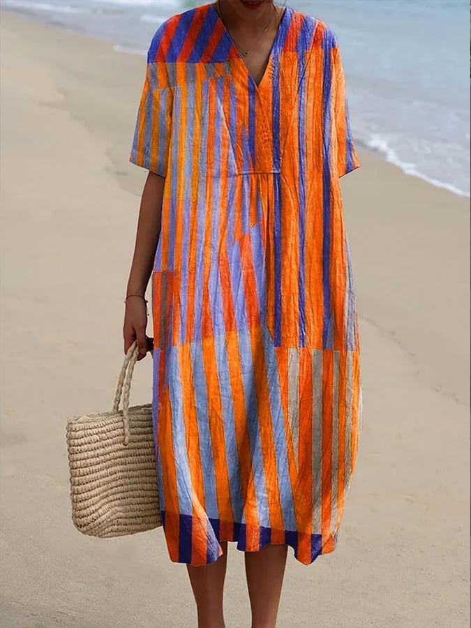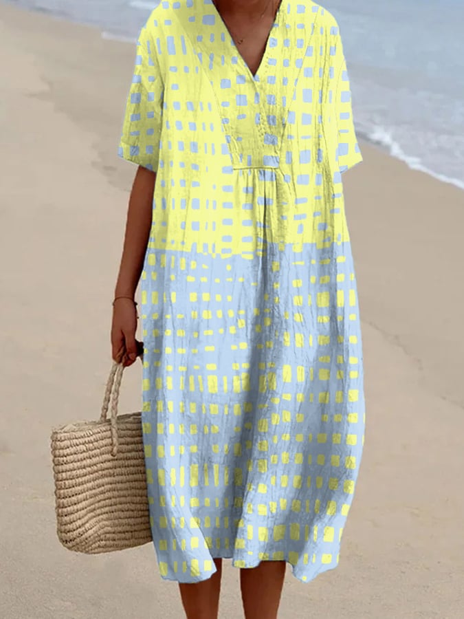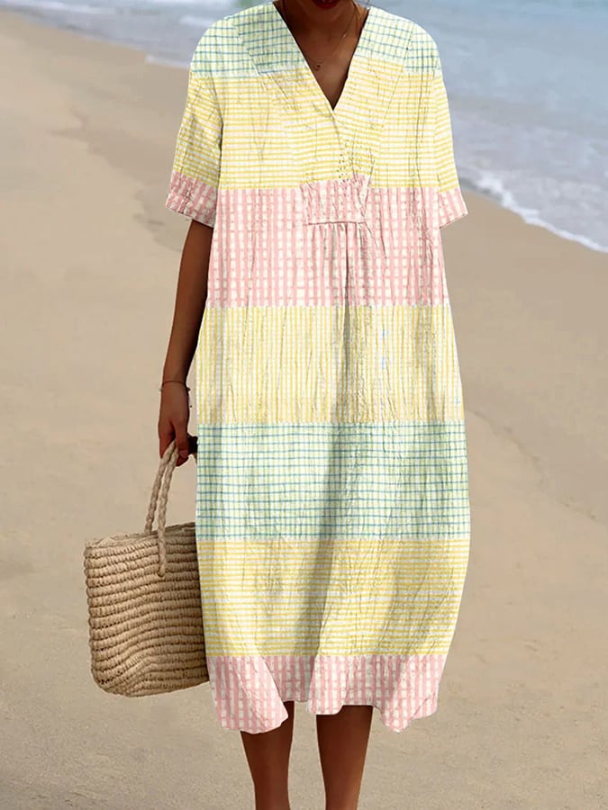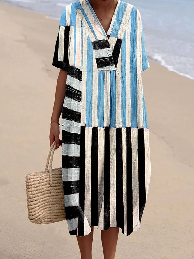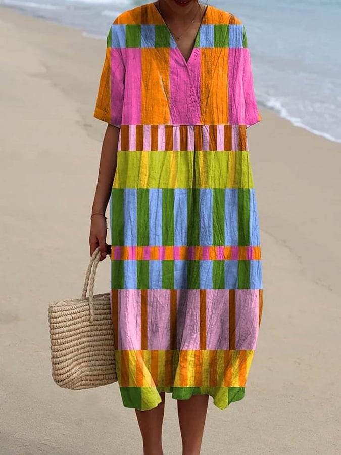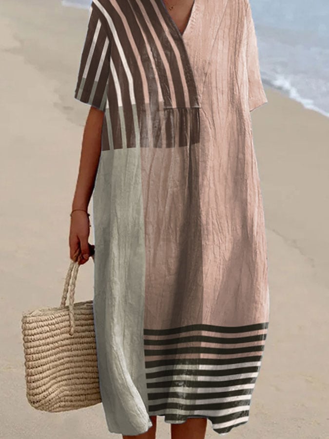 Women's Casual V-Neck Abstract Color Block Loose Dress